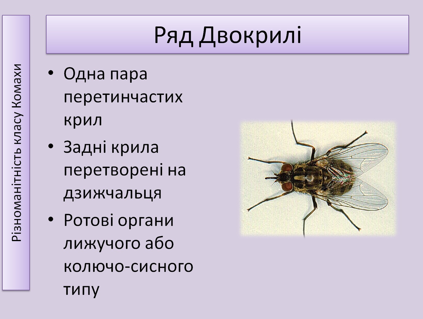 Ряд Двокрилі об’єднує комах, що мають лише два передніх прозорих крила і рот у вигляді хоботка. (Пригадай, скільки крил звичайно має комаха.) Задня пара крил недорозвинена і перетворилася на дзижчальця — саме вони видають наближення комарів та мух настирливим «писком» або «дзвенінням». Ряд налічує близько 85 000 видів комах і поділяється на дві групи: комарі та мухи.